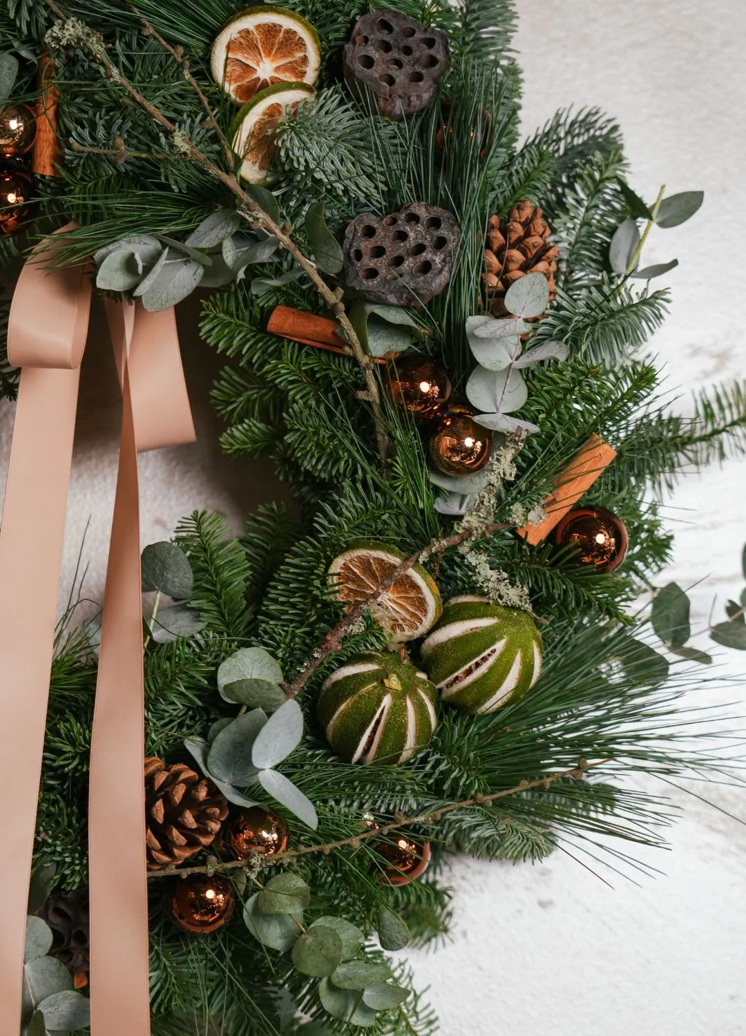 Duży (ok. 45 cm) – z wstążką w kolorze beżu. Efektowna dekoracja na drzwi lub ścianę.
